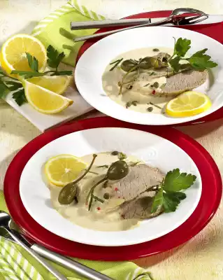 Chop half the parsley. Cut the meat into thin slices. Serve with sauce, parsley, rest of capers and lemon. Serve with crispy ciabatta