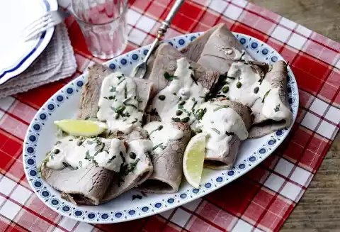 For the sauce puree tuna with brine, 2 tbsp. capers, anchovy fillets, salad mayonnaise, vinegar, white wine and cream very finely. Season to taste with salt, pepper and sugar.