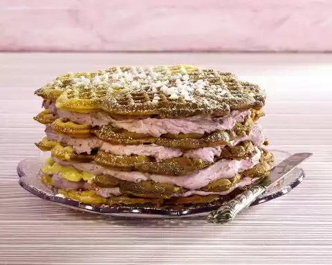 Heat up the waffle iron and grease it lightly. Put a tablespoon of dark dough on one half of the waffle iron, on the other half light dough. Bake 5-6 waffles one after the other from the dough. Let them cool down. For the cream, whip the cream until stiff, pour in the cream firming agent. Pour red wine into a fat-free mixing bowl. Add the dessert powder and mix briefly with the whisk of the hand mixer on the lowest setting. Then whip for approx. 2 minutes on the highest setting to a thick, frothy cream. Briefly stir in the cream with the whisks on the lowest setting. Lay the waffles and cream alternately into a cake.