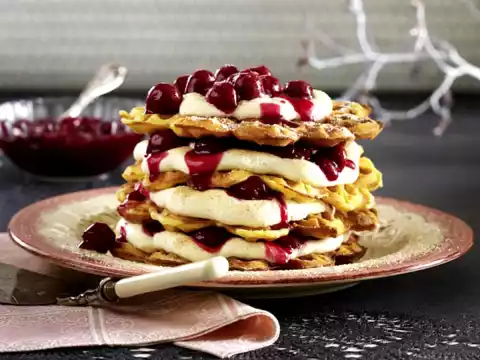Add 2 tbsp. cherry compote and sprinkle with cinnamon sugar. Place the next waffle on top and stack the rest in the same way. Cut the wafer cake into pieces. Add the remaining stewed cherries