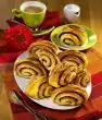 Let the compote cool down. Cream fat, 50 g sugar, 1 packet vanilla sugar, lemon peel and salt. Stir in the eggs one by one. Mix flour and baking powder, alternately stir in with the milk. Preheat waffle iron and grease lightly. Bake 4 waffles one after the other from the dough. Let them cool down. Whip the cream and sour cream until stiff, adding cream firmer and 1 sachet of vanilla sugar. Pour into a piping bag with a perforated spout. Mix 2 tablespoons sugar and cinnamon. Place a waffle on a plate and squirt 1/4 of the sour cream on top.