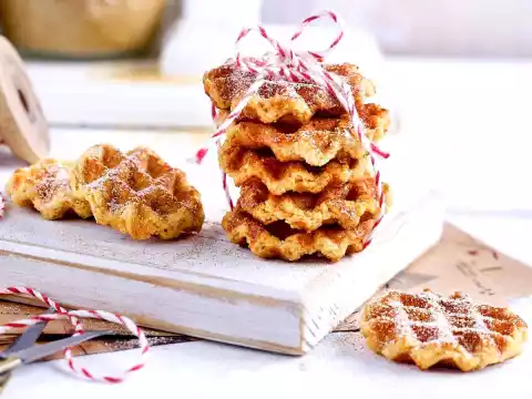 Shape the dough with lightly oiled hands in portions into walnut-sized balls and place 5 balls in the middle of each heart shape in a preheated waffle iron and bake for 2-3 minutes until golden brown. Let the cookies cool on a cake rack. Mix 1 tsp. spice with icing sugar and dust the cookies with it.