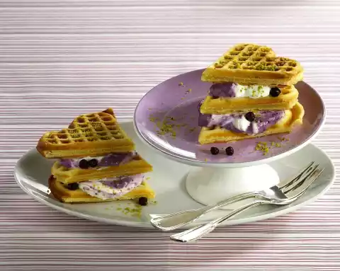 Bake 6 waffles one after the other from the dough. Divide the waffles into 5 hearts each. For each turret on 2 hearts give 1 tablespoon of cream and some blueberries. Place the third heart on top and press down a little.