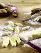 Chop white couverture, melt over a warm water bath. Soak gelatine in cold water. Whip cream until stiff. Beat 2 eggs with the whisk of the hand mixer. Squeeze the gelatine and dissolve.