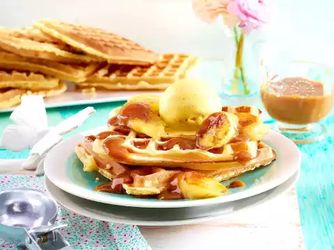 Arrange two waffles with a scoop of vanilla ice cream and bananas on 4 plates, pour caramel sauce over each and serve immediately.