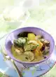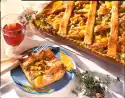 Wash, clean and halve or quarter the strawberries. Bring rhubarb to the boil with 7-8 tbsp. water and lemon zest, cover and stew for 3-4 minutes. Stir starch and some water until smooth. Bring the rhubarb to the boil. Stir in starch and bring to the boil. Fold in strawberries. Season compote with about 1 tbsp. sugar and let it cool down. Remove lemon peel