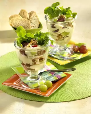 Wash the lettuce leaves, dab dry and place in 4 glasses. Season salad again and distribute in the glasses. Crispy baguette tastes good with it
