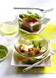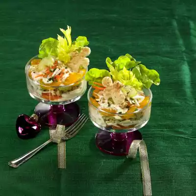 Chop walnuts coarsely. Wash chives, dab dry and cut into fine rolls. Layer all ingredients in glasses. Toast bread, cut out angels and place on the salads. Garnish with salad and celery green if desired