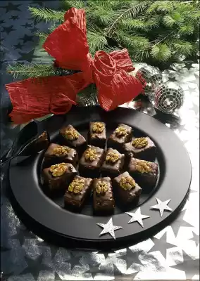Bake in the preheated oven (electric oven: 175 °C/ gas: level 2) for approx. 35 minutes. Melt the chocolate coating in a warm water bath. Cut cake into small pieces and cover with chocolate coating. Press one walnut half each into the moist icing.