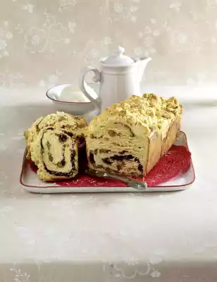 Spread the egg white-sugar-mixture on top, leaving about 2 cm of edge free. Sprinkle with chocolate and nuts. Roll up the dough from the long side, press the ends together in a ring. Turn the ring 3-4 times and place it in a buttered box form (11.5 cm x 30 cm; 7.5 cm high), let it rise for about 30 minutes. Meanwhile, for the crumbles, knead 150 g flour, 75 g sugar, 1 pinch of salt, 75 g butter and 1 egg yolk with your hands to form crumbles, chill. Sprinkle the cake with the crumbles and bake in the preheated oven (electric range: 175 °C/ convection oven: 150 °C/ gas: level 2) for 45-55 minutes. (If the crumbles get too dark, cover the cake with aluminium foil.) Let it rest in the tin for about 15 minutes, then take it out and let it cool down on a cake rack. Tastes hot and cold