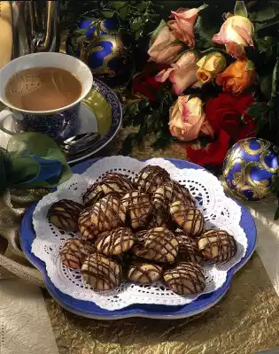 Finely grind the walnuts. Beat egg white until stiff. Add sugar and vanillin sugar. Fold in 1/3 of the beaten egg white and the walnuts with a dough scraper. Carefully fold in the rest of the beaten egg white. Line 1 baking tray with baking paper. Add 21-22 blobs (1/2 teaspoon) of dough and bake in a preheated oven (electric range: 200 °C/ gas: level 3) for approx. 8 minutes. Let it cool down on a cake rack. Bake the rest of the dough in the same way. Melt the chocolate coating in a hot water bath. Pour into a freezer bag.