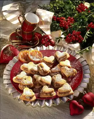 Let it cool down. Finely chop the walnuts. Mix nuts, sugar, butter, orange fruit and cream in a pot and bring to the boil. Let simmer for about 2 minutes while stirring. Spread the mixture into the middle of the big hearts.