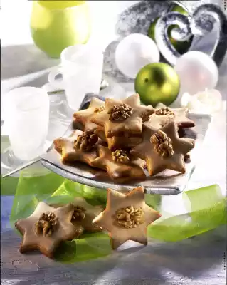 Chop the ginger finely. Finely grind 50 g walnuts in the universal chopper. Coarsely dice butter, knead with flour, ginger, egg, walnuts and salt to a smooth dough. Cover and chill for about 30 minutes. Then roll out to a thickness of approx. 3 mm on a lightly floured work surface. Cut out stars (6-7 cm Ø).