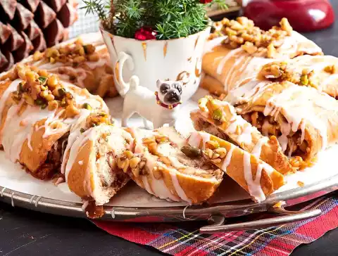 Mix icing sugar and approx. 2 tbsp. almond drink to a thick smooth icing. Sprinkle the icing over the still warm stollen. Spread the rest of the nut mixture on top. Let the stollen cool down.