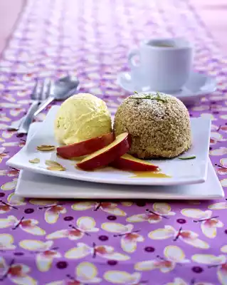 Roast the almonds in a pan without fat until golden brown, take them out. Wash the apple, grate dry, cut into quarters, remove the core and cut the apple quarters into three. Caramelise sugar with 1 tbsp. water, deglaze with apple juice and toss apple slices briefly. Take cups out of the oven, let them cool down briefly and turn 1 cake onto each plate. Arrange 3 apple slices, flaked almonds and 1 scoop of vanilla ice cream on each plate