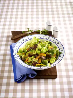 Peel and finely dice the shallots. Peel and wash carrots and cut into thin strips. Wash the meat, dab dry and cut into slices. Clean and wash the Brussels sprouts and carefully remove the individual leaves. Wash parsley, dab dry, remove leaves and cut finely