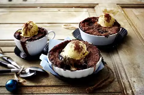 Mix 35 g cocoa and 110 g brown sugar. Spread about 2/3 of the cocoa-sugar mixture evenly on the dough in the moulds. Pour 425 ml boiling water evenly into the 6 moulds on the dough.