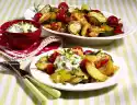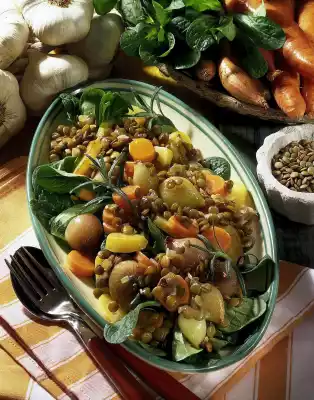 Cover and cook for about 20 minutes. Add carrots after about 10 minutes and cook. Pluck rosemary needles from the stalks. Drain vegetables and lentils and season with salt, pepper, rosemary and vinegar. Clean, wash and drain the lamb's lettuce. Line a plate with lamb's lettuce and arrange the potato salad on top