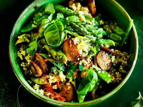 Wash basil, shake dry and pluck leaves from the stalks. Wash lemon hot, rub dry. Peel half of the peel in short strips with a zest ripper. Halve the lemon and squeeze the juice. Mix juice, tahini, mustard, honey and vinegar. Season with salt and pepper. Fold in 4 tablespoons of oil. Mix asparagus, snow peas, carrot, mushrooms with garlic, basil, except for something to garnish, lemon peel, quinoa and dressing. Serve and garnish with basil.