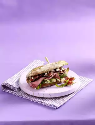 Wash figs, remove stalks. Cut figs into slices. Remove baguette halves. Cover baguette halves with rocket. Place slices of roast beef and figs on top. Sprinkle with honey as desired, sprinkle with pepper and remaining cheese.
