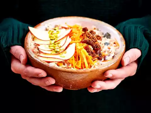 In the meantime, chop the figs into small pieces. Wash, quarter, core and slice or cut the apple into thin slices. Fill porridge into bowls. Arrange the apple, figs, pistachios and the rest of the carrots on top. Serve immediately.