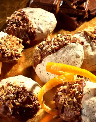 With the help of a teaspoon, place small almond heaps on top. Bake in the preheated oven (electric cooker: 150-175 ° C/ gas: level 1-2) for about 20 minutes. Let it cool down. In the meantime, break the chocolate into pieces and melt it on a hot water bath. Dip half of the macaroons into the liquid chocolate and place them on a cake rack to drain. Sprinkle with the remaining grated coke and leave to dry