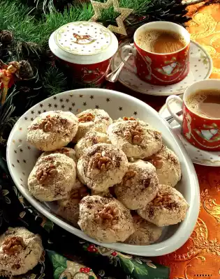 Carefully fold in almonds and chocolate. Spread the wafers on a baking tray. Use 2 teaspoons of egg foam mixture to place some on each wafer and decorate with a walnut half. Bake in the preheated oven (electric: 150 °C / gas: level 1) for about 35 minutes.