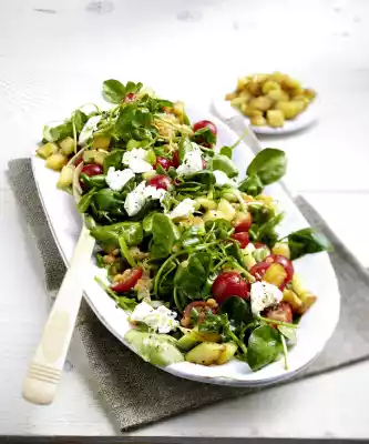 For the vinaigrette, mix vinegar, salt, pepper and sugar. Fold in 4 tablespoons of oil. Mix watercress, tomatoes, spring onions and lentils. Pour the vinaigrette over it and mix. Arrange on a plate. Crumble cream cheese over it and sprinkle with pepper. Sprinkle a few potato croutons on top, add the remaining croutons