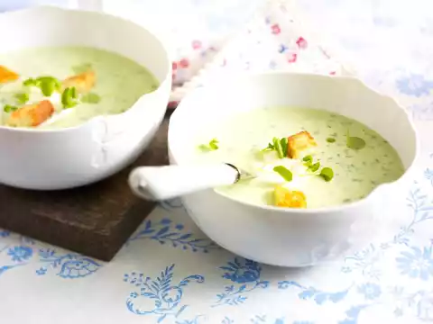 Gradually deglaze with stock and cream while stirring. Bring to the boil, season to taste with salt, pepper and sugar. Add the chopped herbs. Pour into small bowls, add a dash of crème fraiche and sprinkle with watercress leaves.