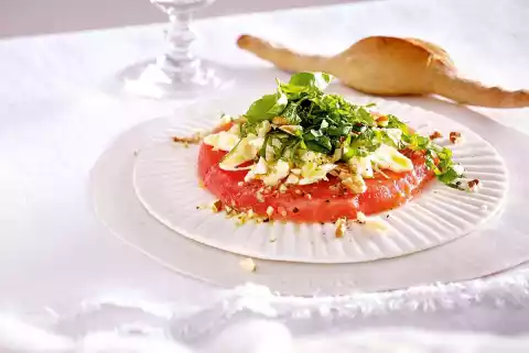 From the middle of the melon, cut 4 slices about 2 cm thick. Cut off the skin all around the melon, remove seeds if necessary. Put 1 melon slice on each plate. Pluck the mozzarella and spread on top. Add the herbs. Sprinkle evenly with the vinaigrette. Sprinkle with nuts. Garnish with basil leaves. Serve with muck sticks* or baguette.