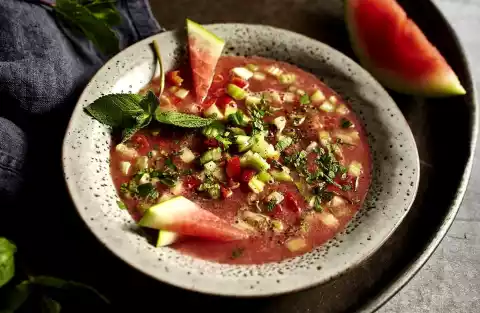 Cut the melon into pieces, leaving something aside for garnishing. Peel melon. Peel and chop the onion. Finely mash melon and onion with nectar and toast. Season to taste with vinegar, salt and pepper.
