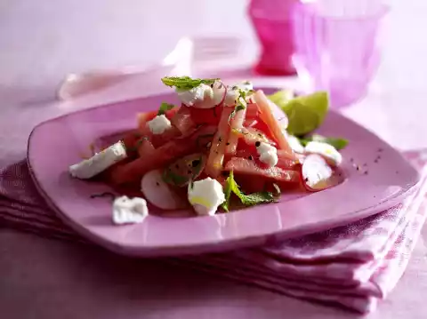 Cut the melon into slices. Cut the flesh first from the skin, then into strips, removing any seeds. Clean and wash the radishes and cut or slice them into thin slices. Wash mint, dab dry and cut into fine strips, except for a little garnish. Put melon, radishes and mint in a bowl. Halve 1 lime and squeeze it.