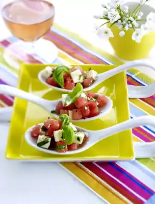 Mix vinegar, melon, feta and basil, season with salt, pepper and 1 pinch of sugar. Chill the salad for about 1 hour. Arrange the salad on spoons or in small bowls and garnish with the remaining basil