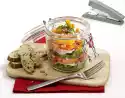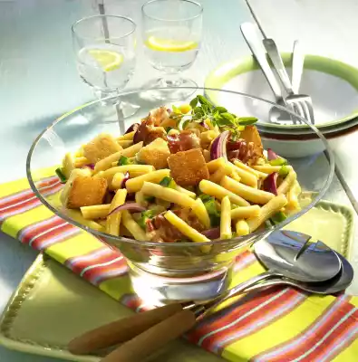Deglaze with 5 tablespoons of vinegar and 3 tablespoons of oil while stirring. Drain the beans on a sieve. Put onions, peppers and beans in a bowl. Pour the marinade over it and let it soak well. Season again with salt, pepper and vinegar. Drain the bacon in a pan, remove and break into pieces. Cut bread into cubes. Heat 1 tablespoon of oil in the bacon fat. Fry the bread cubes in it until golden brown.
