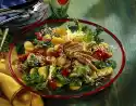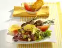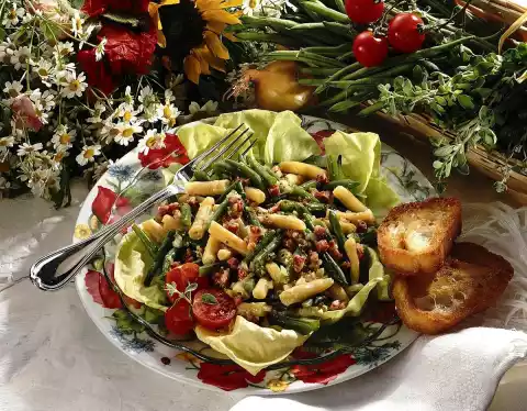 Let everything go through. Wash and drain the lettuce leaves. Spread the lettuce leaves on the plates. Arrange bean salad on top. Garnish with halved cherry tomatoes and marjoram. Fried slices of bread taste good with it.