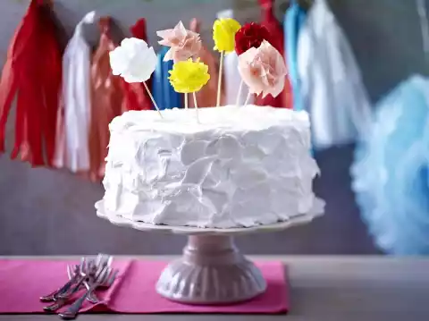 Loosely spread half of the egg white icing all around a cake. Leave to rise for about 15 minutes. Now carefully place the second cake on top and also spread the second half of the egg white icing loosely. Leave to dry for about 2 hours. Arrange on a cake plate. Decorate with colourful pompoms