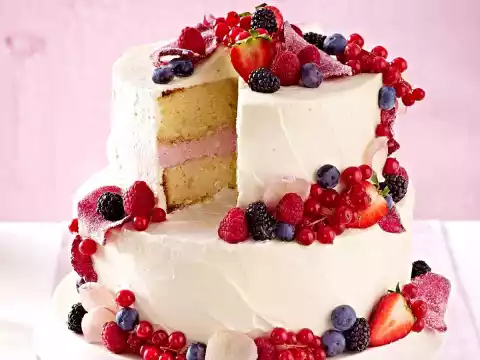 Carefully remove the cakes from the rings. Whip 750 g cream until stiff, while pouring in 2 tbsp. icing sugar and 2 sachets of cream firming agent. Spread both cakes with this mixture and chill for about 10 minutes. Carefully place the cakes on top of each other and decorate with dried petals and remaining berries. Put in a cool place