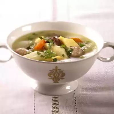 Cook the asparagus and carrot for 10-12 minutes. Remove meat from fat and bones and dice finely. Press the sausage mixture as dumplings from the skin directly into the soup. Cook with the peas for about 5 minutes, season to taste.
