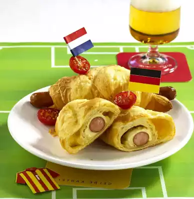 Spread each with 1 tablespoon of mustard cream. Place one sausage on each broad end and roll up. Grate cheese and sprinkle on the dough. Bake in the preheated oven (electric cooker: 200 °C/ convection oven: 175 °C/ gas: level 3) for 10-15 minutes.