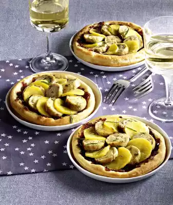 Peel the skin off the veal sausage. Heat the oil in a pan. Fry the veal sausages for about 3 minutes, turning them over. Cut sausages into 2-3 mm thin slices. Spread puff pastry with onion confit, spread Weißwurst and potato slices fan-shaped.