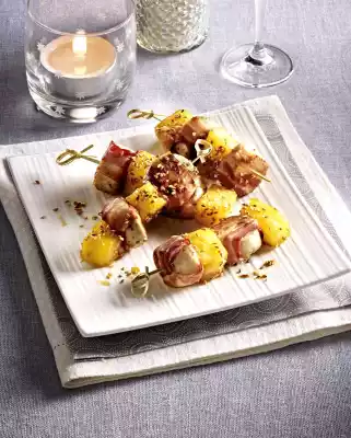 Cut each veal sausage into about 6 pieces. Halve the bacon slices. Wrap 1 bacon strip around 1 piece of sausage. Put pineapple and white sausage alternately on the skewers, grill on a baking tray under the hot grill for about 5 minutes, turning, until the bacon becomes crispy.