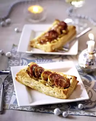 Remove the puff pastry tartlets from the oven. Spread slices of sausage on the onion puree, season with pepper and serve warm.