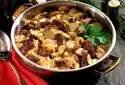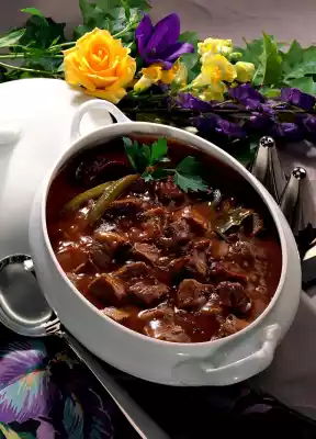 Brown the onions and diced meat in it. Season with salt and pepper. Add cucumbers, beef stock, cloves, bay leaves and peppercorns. Cook over medium heat for about 1 1/2 hours. Add diced gherkins.