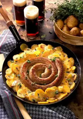 Drain the sausage string well and prick it several times with a wooden skewer so that it does not burst when roasting. Heat the lard in a pan and fry the sausage ring well on both sides. Lift it out, put potato slices into the pan and season with salt, pepper and marjoram (except for a little to garnish).