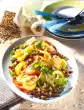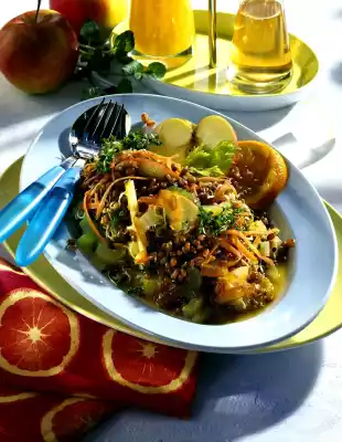 Cut the flesh into narrow slices and sprinkle with lemon juice. Mix prepared ingredients and oil. For the vinaigrette, warm up the orange marmalade. Mix with vinegar and mustard. Stir into the salad and arrange on a plate. Cut the cress briefly and sprinkle over it. Serve garnished with orange, apple and celery green