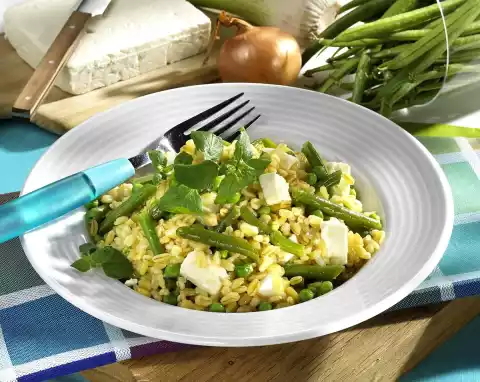 Add the peas to the risotto 5 minutes before the end of the cooking time. Wash the herbs, dab dry and chop finely. Cut the cheese into pieces and fold into the wheat risotto with the herbs. Season to taste with salt and pepper.