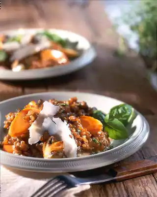 Soak wheat overnight in 1500 ml warm water. Soak porcini mushrooms for about 30 minutes in 300 ml hot water. Meanwhile peel and roughly dice onions. Peel garlic and chop finely. Wash thyme, dab dry and pluck the leaves from the stems. Clean the mushrooms and halve them as desired. Pour the porcini mushrooms onto a sieve and collect the soaking water. Drain porcini and chop finely. Heat the oil in a casserole dish and fry the mushrooms thoroughly. Add onions, garlic, 3/4 of the thyme and porcini mushrooms. Fry briefly. Meanwhile pour the wheat on a sieve and let it drain. Add wheat, sauté briefly and gradually add stock and soft water. Cook the wheat risotto at medium heat for about 60 minutes. Stir several times. Clean, wash and slice the carrots. Grate the Parmesan finely. 10 minutes before the end of cooking time add carrots and parmesan and stir in cream. Season risotto with salt and pepper. Serve on plates, sprinkled with remaining thyme. Garnish as desired with basil and parmesan slices