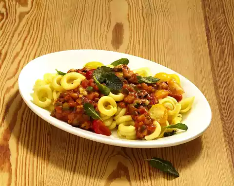 Wash and clean the zucchini and eggplant and cut into fine cubes. Heat 2 tablespoons of olive oil in a pan. Fry the bell peppers, zucchini and aubergine thoroughly. Add onion and garlic and sauté. Stir in tomato paste. Deglaze with chunky tomatoes and simmer for about 10 minutes. In the meantime cook the pasta in boiling salted water according to the instructions on the packet. Season the sauce with salt, pepper, 1 pinch of sugar and herbs of Provence. Add the halved tomatoes to the ratatouille sauce and heat it up. Wash the sage, shake dry and remove the leaves from the stems.