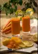 Mix whey, tomato, carrot and orange juice and oil, season with salt, pepper and lemon juice. Pour into a glass and serve with straws or a lemon wedge