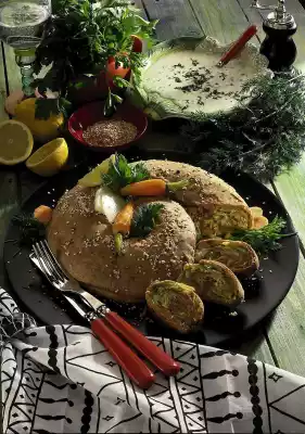 Wash the herbs, chop them except for a rest and add 2/3 of them to the sauce. Season the sauce to taste. Arrange the strudel snail on a plate. Garnish with the drained vegetables and the remaining herbs and serve with the sauce.